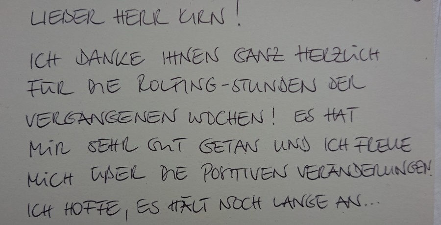 Mittlerweile habe ich das Vorruhestandsalter erreicht und mir den Wunsch erfüllt, nur noch mit Rolfing zu arbeiten und die Zahnmedizin bleiben zu lassen. Der Wechsel fällt mir leicht, Zahnmedizin war Beruf, Rolfing® Strukturelle Integration scheint Berufung.